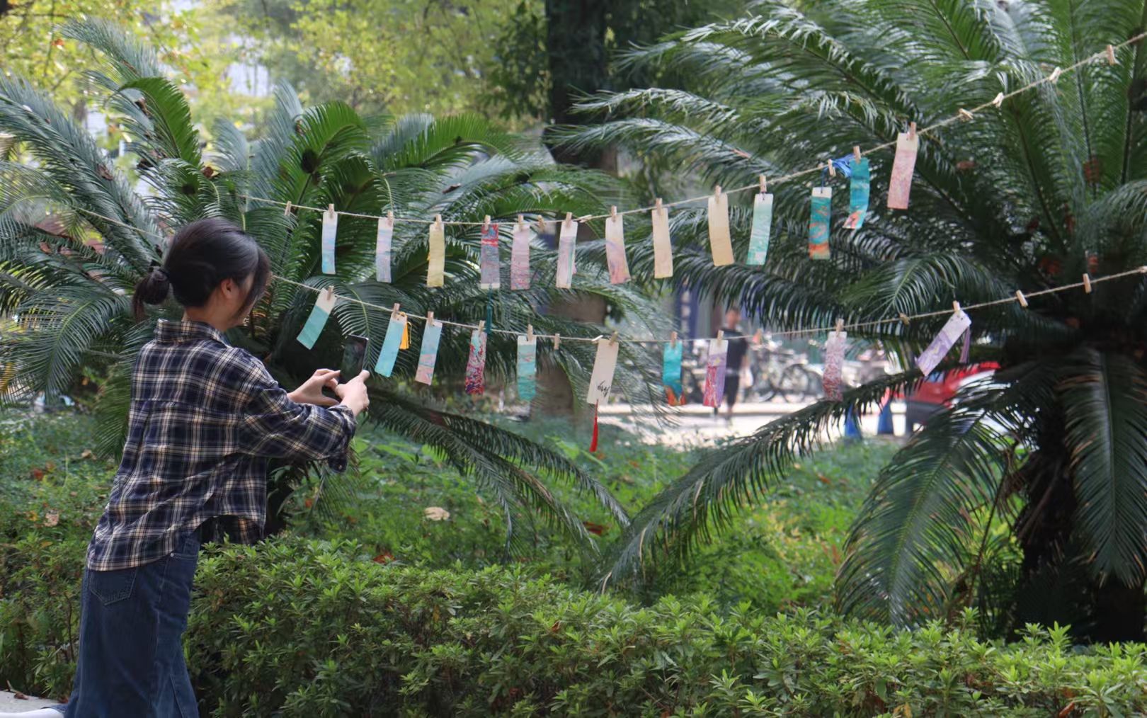 活动伊始,志愿者进行现场宣传,吸引大量同学加入到活动当中。随后,志愿者向同学们讲述漆扇的制作工艺,并通过手工成品展现漆扇的历史韵味和文化意趣。活动过程中,志愿者引导学生参与制作漆扇书签,包括准备颜料、绘制空白书签、写下祝福寄语。活动结束后,志愿者将学生的作品收集并展示,与同学们互相交流心得。