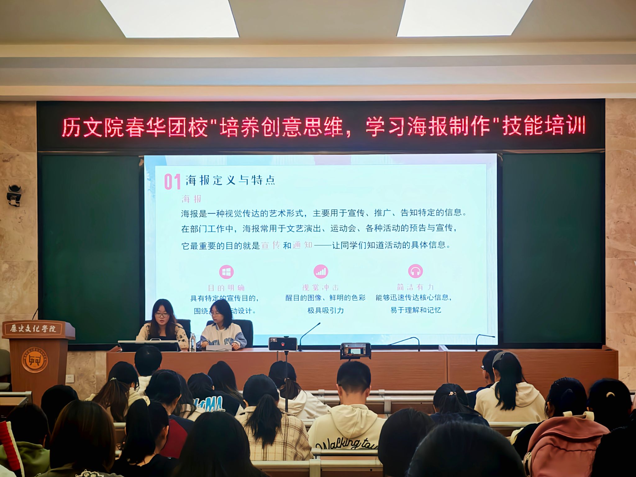 培训会上,李卓颖从色彩搭配、字体选择、图片处理三大方面,讲述海报设计的基本要求。她指出,一张优质的海报要突出主题,并以独特的视觉效果引人入胜,准确地传达信息。接着,孟湘向学员们阐述了创意思维的重要性和培养方法,通过实例展示让学员们理解如何将创意融入海报设计,并鼓励学员运用不同类型的排版技巧来突出重点内容,吸引公众视线。