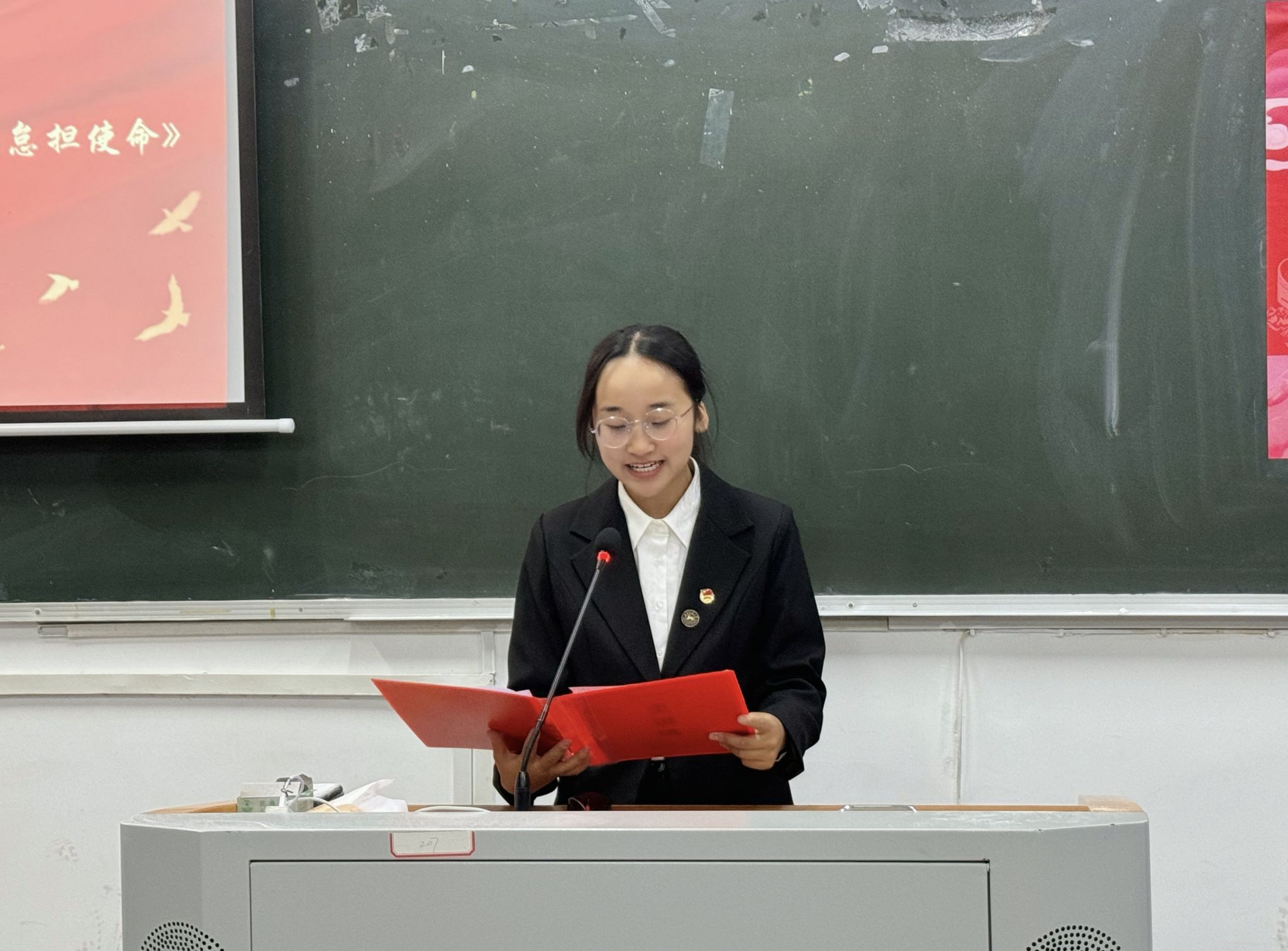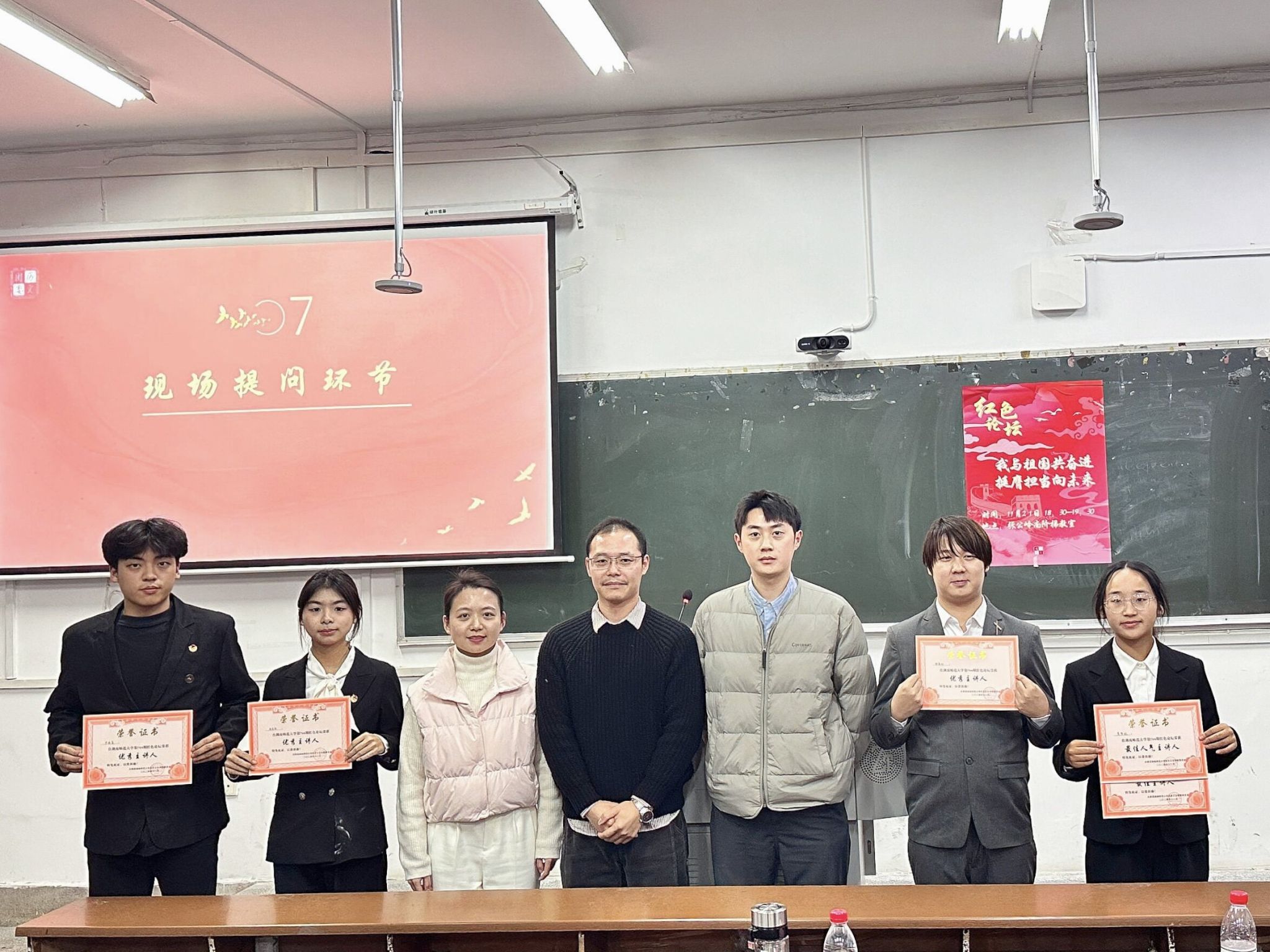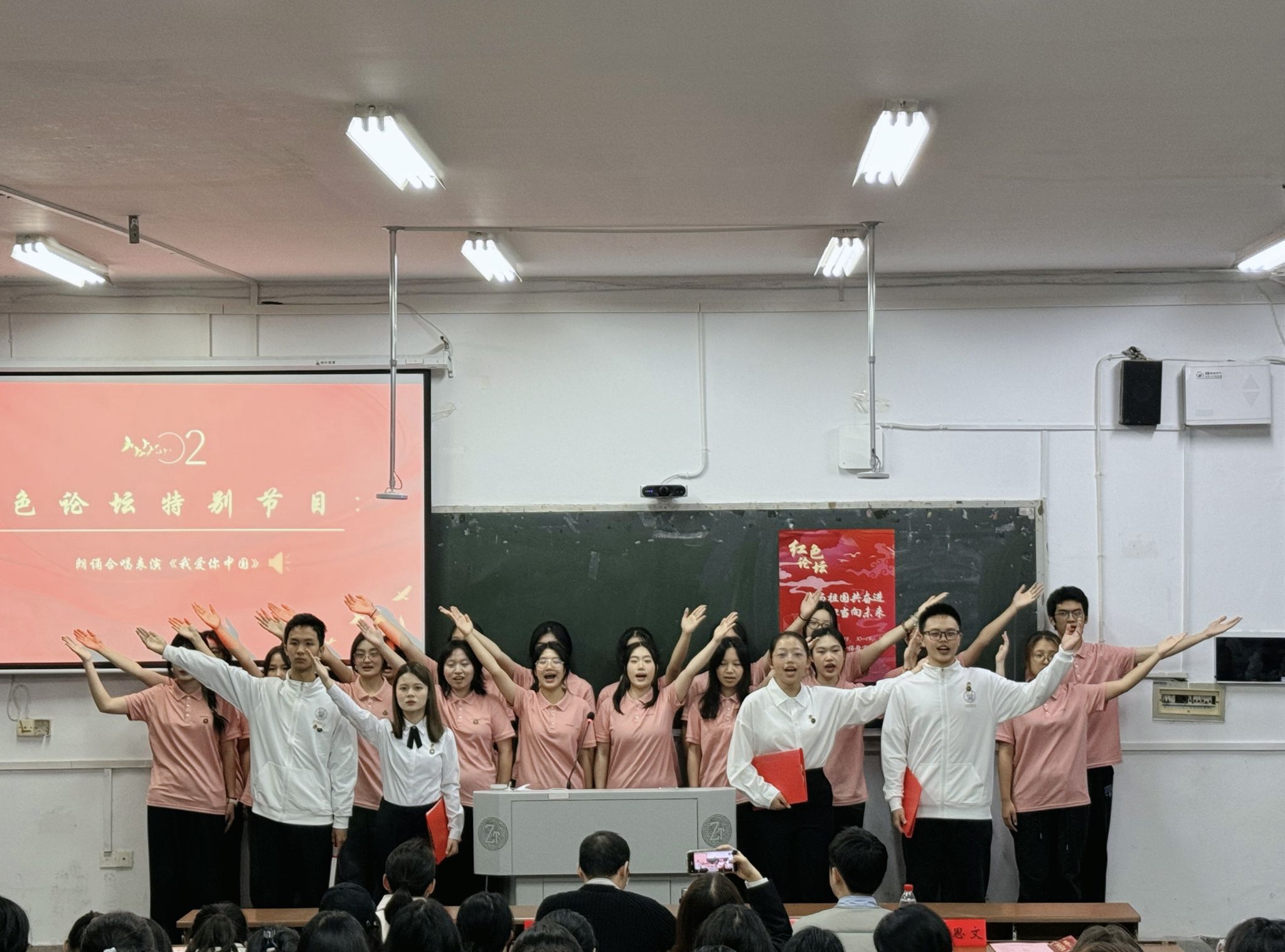论坛伊始,全场肃立,齐唱国歌。随后,开展红色论坛特别节目,青年学子朗诵合唱《我爱你中国》。随后,主讲人黄梦妮、谢康昕、张星雨和尹海旻分别以《不负祖国践初心 ,笃行不怠担使命》《担强国重任,做有为青年》《起航,以青春赴万丈理想》《生逢盛世勇争先,踔厉奋发立潮头》为题,结合自身学习生活实践,从“我与祖国”的青年视角阐释中华人民共和国成立75周年来的光辉历程、伟大成就与宝贵经验,进一步引导大学生理解习近平新时代中国特色社会主义思想和重大会议精神,鼓舞广大青年学子奋发图强,积极进取。接着,观众与主讲人进行问答交流并投票。吴鹏程对此次论坛进行点评与总结,他充分肯定四位主讲人的发言,希望同学们关注时政,加强专业学习,不断提升理论素养。最后,陈卓君宣布评选结果并颁奖。