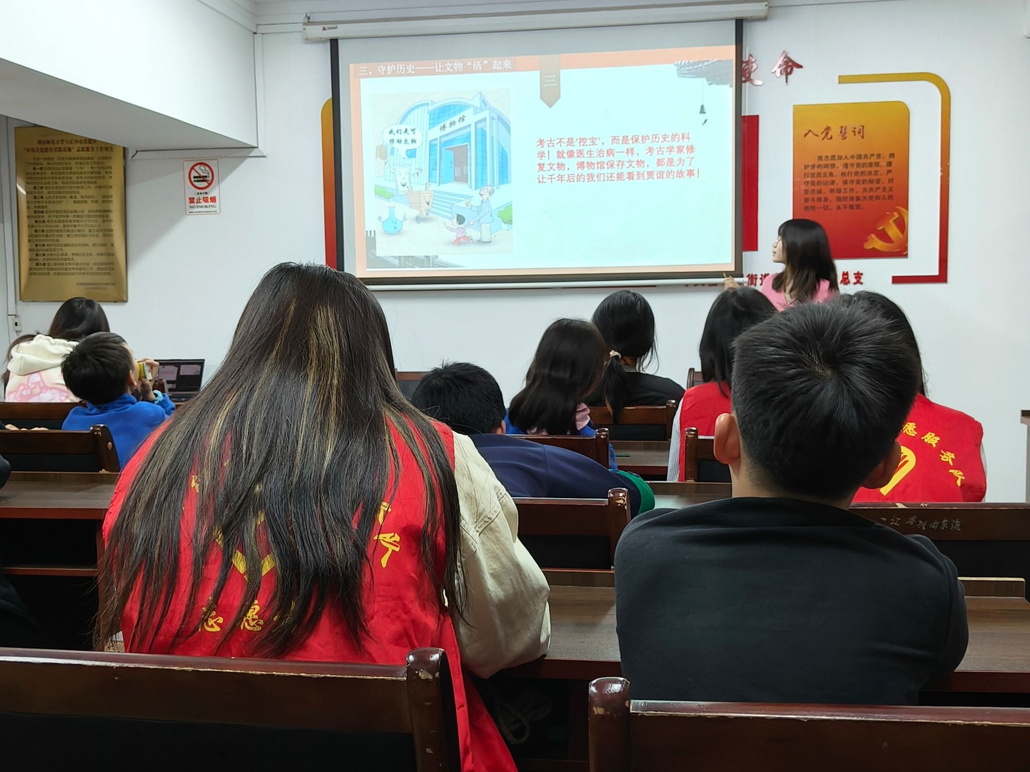 活动伊始,志愿者代表向小朋友们简述西汉文学家贾谊的生平事迹,并以课堂问答的形式将话题引向贾谊故居的保护现状。接着,志愿者代表通过展示贾谊故居的考古发现图和出土文物图,着重介绍了贾谊故居中瓦当拓印文物的工艺特色,促进小朋友们对“瓦当拓印”技艺的了解。手工制作环节,小朋友们在志愿者的指导下充分发挥艺术创造力,制作出各具特色的瓦当拓印作品。活动结束后,志愿者们共同清扫活动现场,并合影留念。