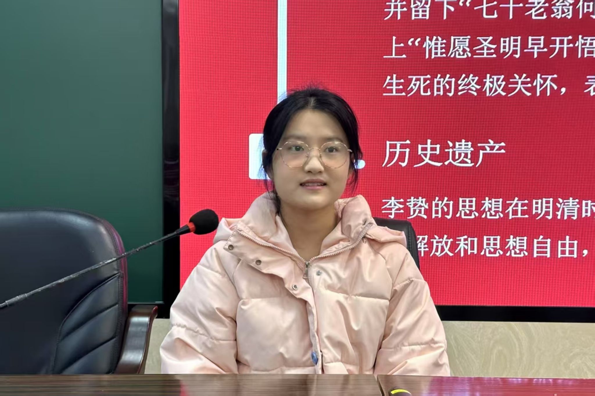 讲堂伊始,伍希以秦始皇为例,解析其“暴君”标签下的制度革新:从“书同文”“郡县制”的文明奠基,到焚书坑儒背后的思想博弈,重点说明了历史评价需突破单一维度。贺文婷则通过李贽“穿衣吃饭即是人伦物理”的颠覆性主张,展现其对理学桎梏的挑战与人性解放的追求,并结合其创办女子书院等事迹,探讨思想先驱在体制压迫下的突围。两位主讲人通过举例出土文献与跨文明对比的方式,引导同学们理解历史叙事的复杂性。在提问环节中,同学们围绕“历史评价的客观性”、“口述史料数字化保存”等话题展开讨论。两位主讲人就同学们提出的问题进行针对性解答,鼓励同学们在研究历史问题时既要严谨求证,也需要质疑框架。