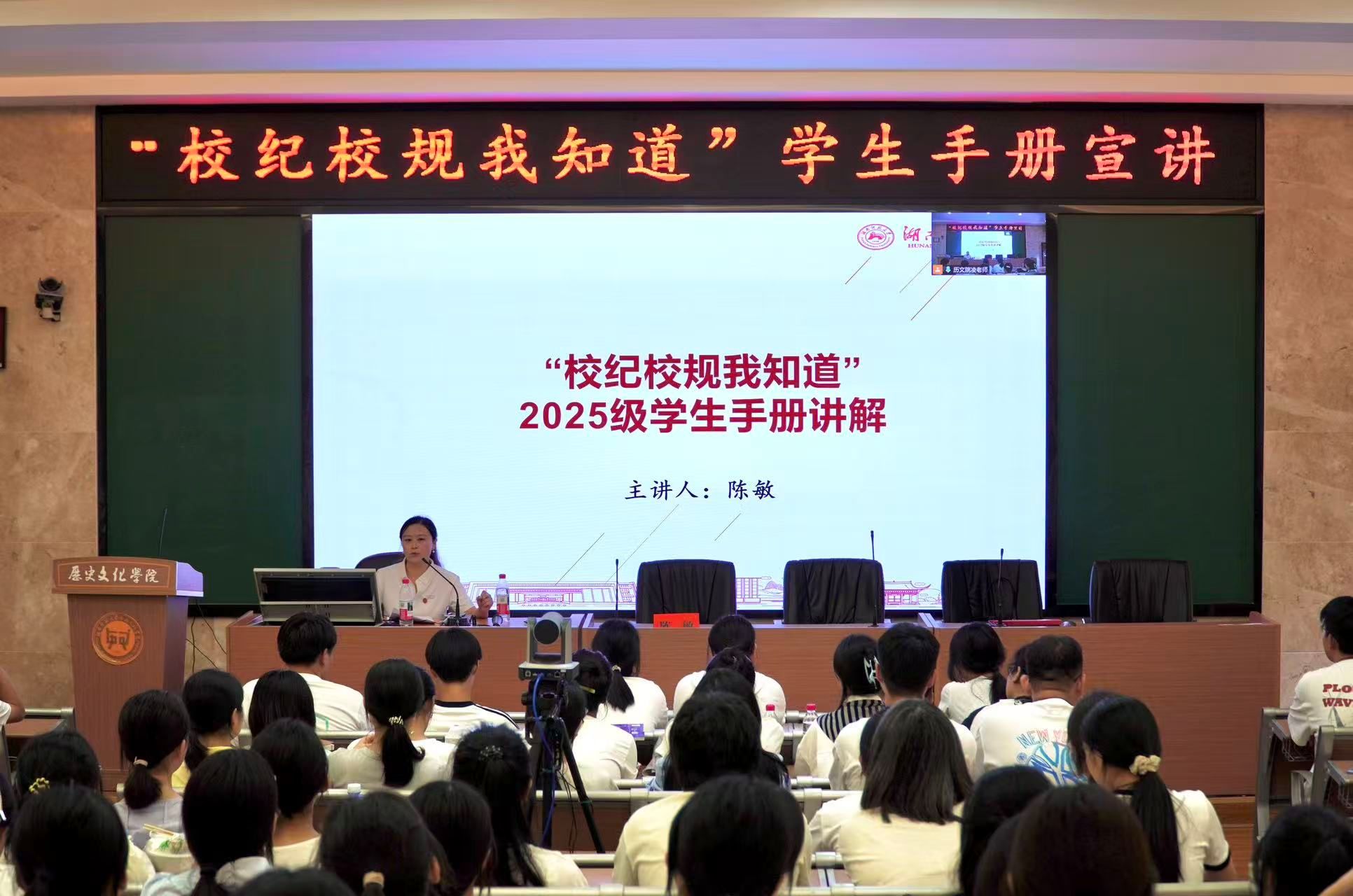(通讯员邓曦雨刘嘉可)9月15日下午,澳门永利集团网址APP于文渊楼202、203教室举办了2025级新生系列讲座之一的"校纪校规我知道"主题讲座。此次讲座由学工办主任陈敏老师主讲,2025级全体新生参加。