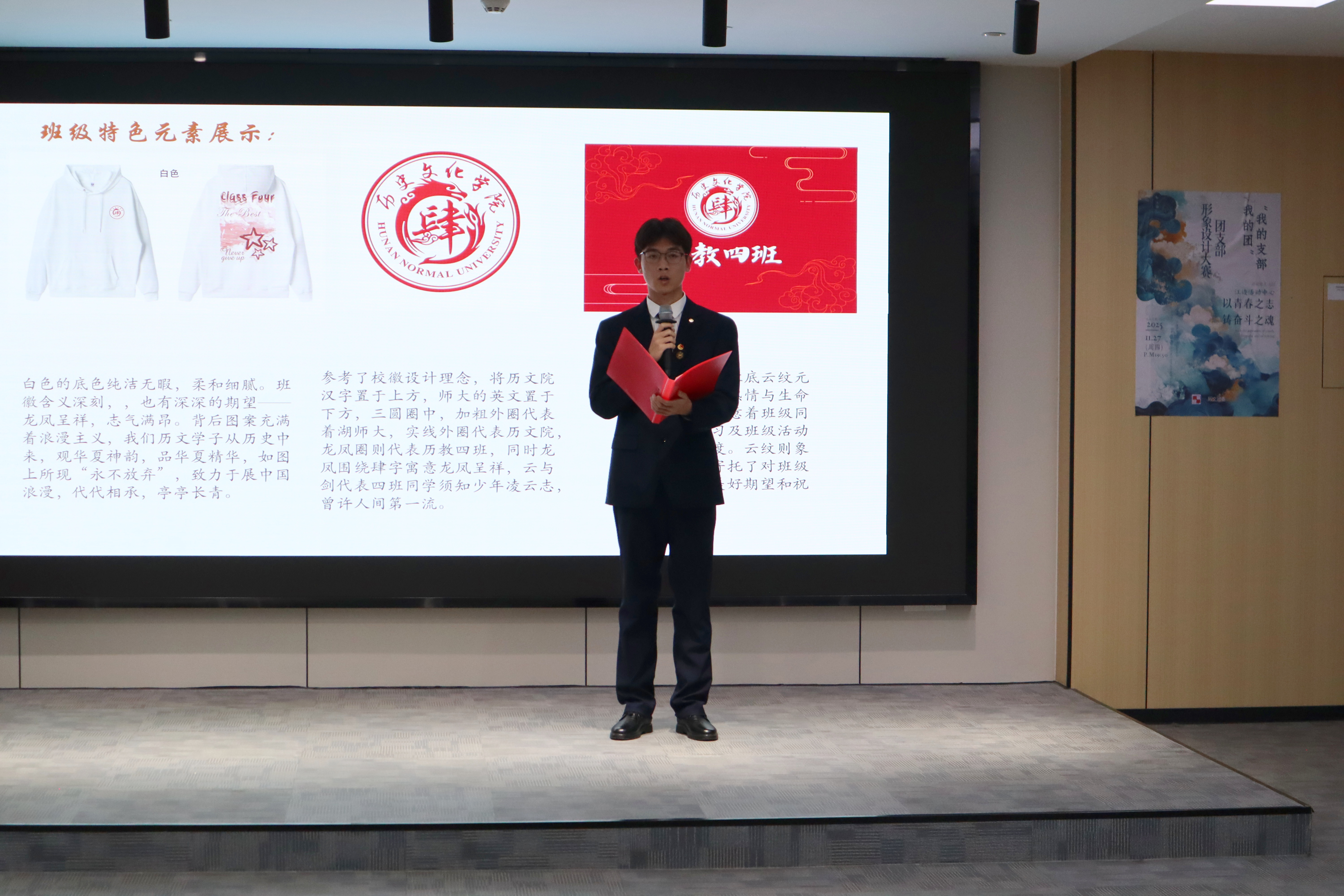 活动在团歌合唱中拉开帷幕。在“回头看”环节,2024级历史四班团支部系统展示了工作亮点,分享了建设经验,为新生团支部提供了有益参考。2025级各新生团支部依次展示,围绕思想引领、学风建设、组织凝聚、宣传发声与活力提升五大方向,通过PPT、视频等形式介绍支部建设规划。各班结合专业特色,从历史典籍与文物研究中汲取灵感,将考据方法与历史思维运用于组织建设,设计出一系列富有特色的班训、班旗等视觉标识。