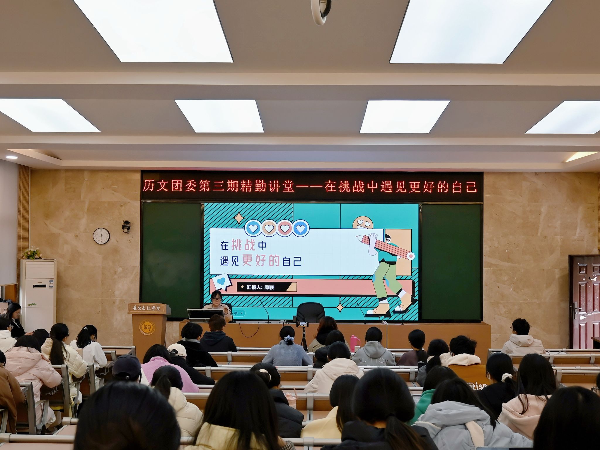(通讯员 刘念 李采宸)12月4日中午,澳门永利集团网址APP团委青创部在澳门永利集团网址APP203学术报告厅举办第三期精勤讲堂“在挑战中遇见更好的自己”。此次活动由2023级周颖同学主讲,青创小组全体成员参加。
