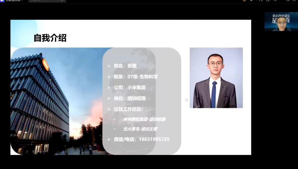 2011届生物科学专业优秀毕业生张卿,现任小米集团培训经理,以“以学业到事业”为题,提出关注自我提升,告诫同学们注重自身素质的提升,以此为未来的成功奠下基础。
